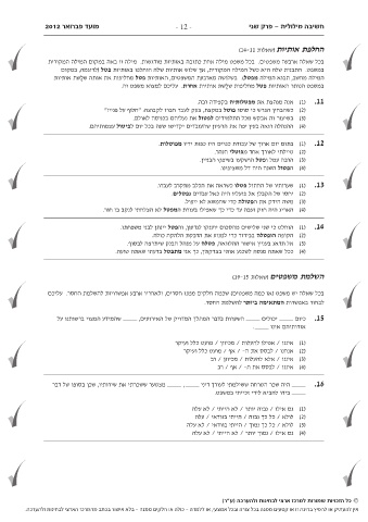 בכל שאלה יש משפט (או כמה משפטים) שכמה חלקים ממנו חסרים ,ולאחריו ארבע אפשרויות להשלמת החסר .עליכם