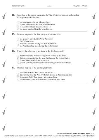 . בלא אישור בכתב מהמרכז הארצי לבחינות ולהערכה- כולה או חלקים ממנה- או ללמדה,אין להעתיק או להפיץ בחינה זו או קטעים ממנה בכל צורה ובכל אמצעי