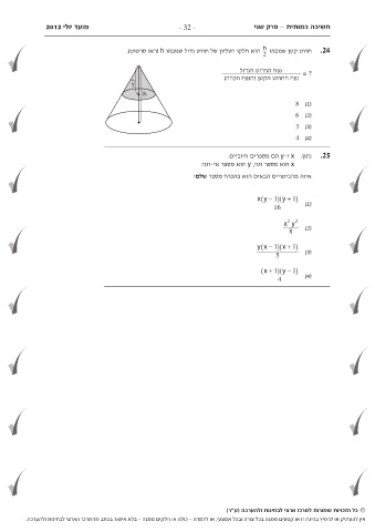 אין להעתיק או להפיץ בחינה זו או קטעים ממנה בכל צורה ובכל אמצעי ,או ללמדה -כולה או חלקים ממנה -בלא אישור בכתב מהמרכז הארצי לבחינות ולהערכה.