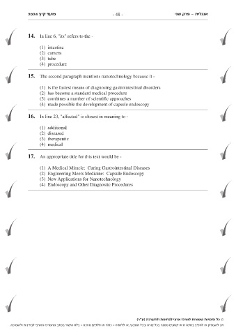 . בלא אישור בכתב מהמרכז הארצי לבחינות ולהערכה- כולה או חלקים ממנה- או ללמדה,אין להעתיק או להפיץ בחינה זו או קטעים ממנה בכל צורה ובכל אמצעי