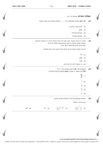 אין להעתיק או להפיץ בחינה זו או קטעים ממנה בכל צורה ובכל אמצעי ,או ללמדה -כולה או חלקים ממנה -בלא אישור בכתב מהמרכז הארצי לבחינות ולהערכה.